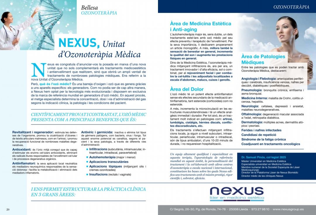 Nexus es congratula d’anunciar-vos la posada en marxa d’una nova unitat que no sols complementarà els tractaments medicoestètics i antienvelliment que realitzem, sinó que obrirà un ampli ventall de tractaments de nombroses patologies mèdiques. Ens referim a la nova Unitat d’Ozonoteràpia Mèdica.